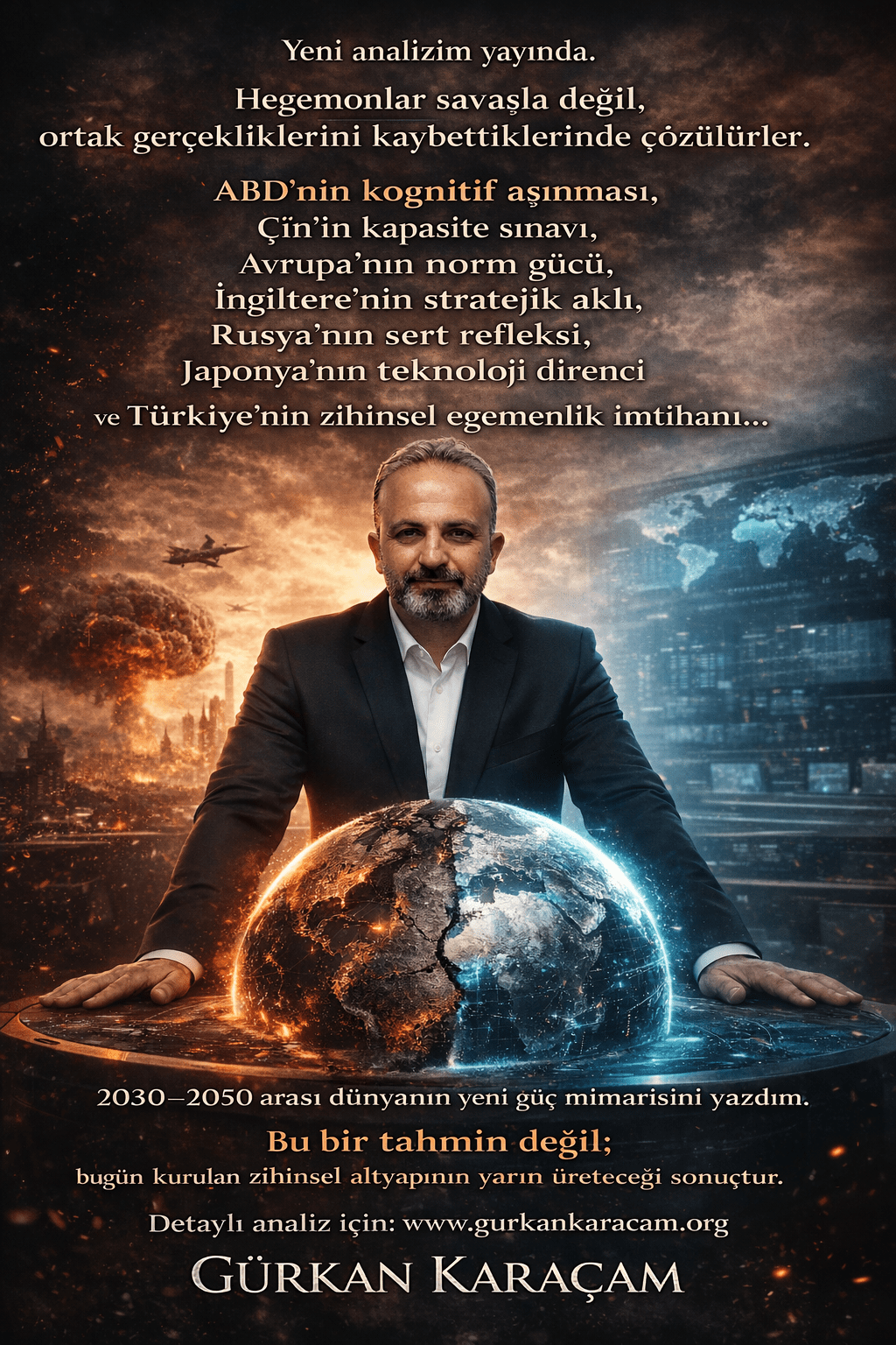 Bu analiz; 2030 dünya senaryosu, 2050 küresel güç dengesi, ABD’nin kognitif çözülmesi ve Türkiye’nin stratejik geleceği üzerine kapsamlı bir jeopolitik değerlendirmedir.