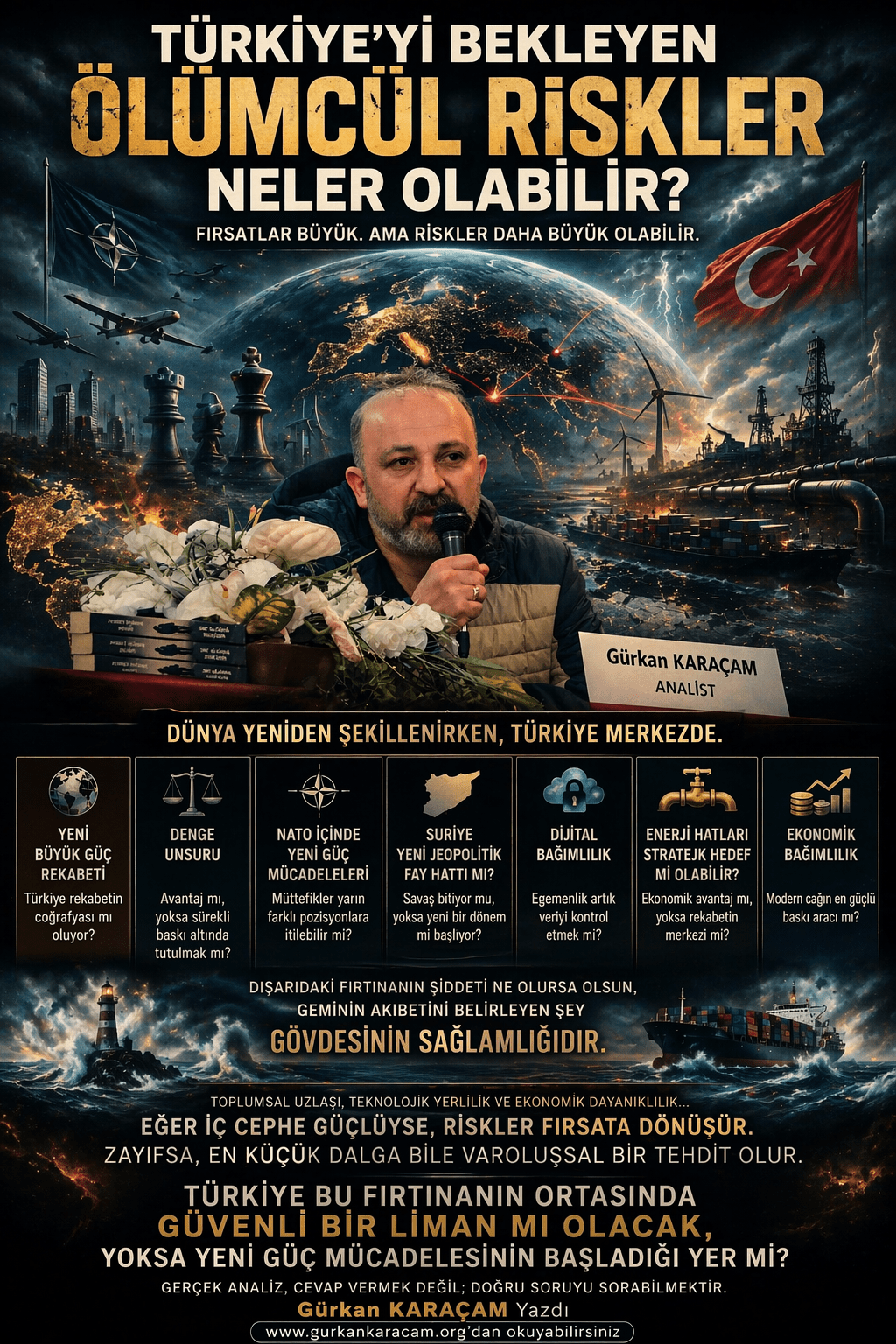 This article explores the potential strategic risks Türkiye may face in an increasingly complex global order. Rather than presenting definitive conclusions, it raises critical questions about geopolitical competition, shifting alliances, energy corridors, digital sovereignty, and economic dependence. As global power dynamics evolve, Türkiye’s unique geographic and strategic position could transform both into a major opportunity and a significant vulnerability. The analysis suggests that understanding these risks requires asking the right questions rather than rushing to simple answers. In a world where great opportunities often grow in the shadow of great dangers, Türkiye’s future will depend on its internal resilience, technological independence, and strategic vision.